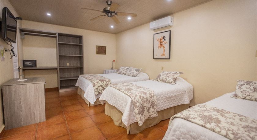 Queen bed and two single beds, closet, safe, private bathroom with hot water, amenities, air conditioning, cable TV, unlimited Wi-Fi.