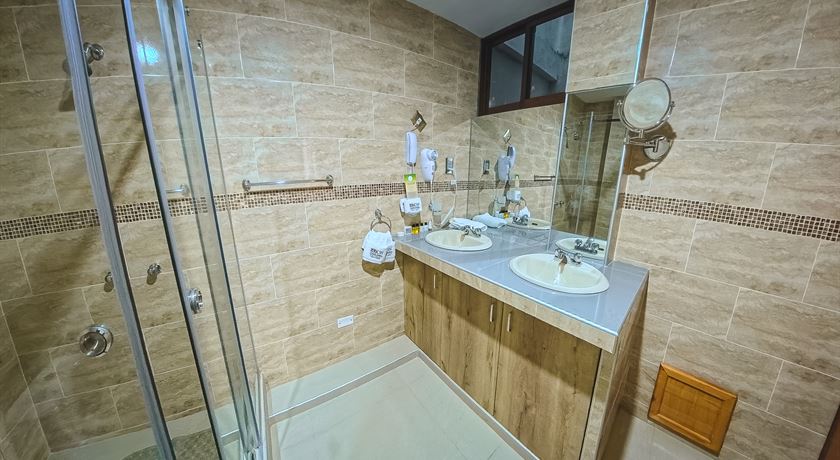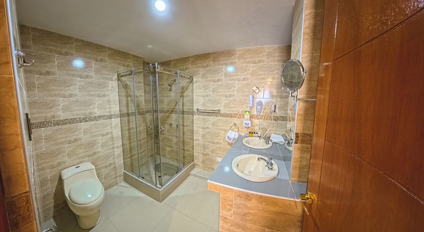 Room with full-size bed, bathroom with walk-in shower, Smart TV, amenities, safe, scales, iron, ironing board, umbrella, wardrobe, hairdryer.